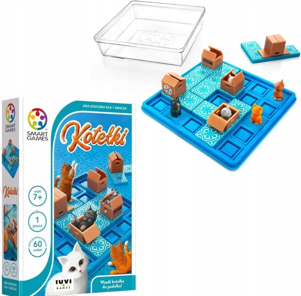 Smart Games Kotełki (PL) IUVI Games - prosta gra planszowa z wesołymi kotkami!Pomóż każdemu kotkowi znaleźć idealne pudełko! Gra planszowa Smart Games Kotełki (PL) IUVI Games oferuje rozgrywkę pełną ciekawych zagadek logicznych, którą warto polecić całej rodzinie, a można nawet zaproponować ją już siedmiolatkowi. To umieszczona w niedużym pudełku gra z pięknie zaprojektowanymi elementami i wieloma zróżnicowanymi zadaniami logicznymi. W tej uniwersalnej planszówce znajdą coś dla siebie mali gracze, a także ci już dorośli!Dla kogo przeznaczona jest gra Smart Games Kotełki (PL) IUVI Games?dla początkujących graczydla 1 graczadla graczy w wieku od 7 latNa czym polega gra Smart Games Kotełki (PL) IUVI Games?Sekwencyjna gra producenta IUVI Games zaprasza do planszy graczy w różnym wieku. Na czym polega rozgrywka? Każdy kotek w tej grze chce zdobyć własne kartonowe pudło. Jak wiadomo, wszystkie koty je uwielbiają! Zadaniem gracza będzie pomaganie kocim bohaterom w znalezieniu swoich pudełek. Podczas gry układasz elementy zgodnie z zasadami wyzwania, które wybierzesz dzięki specjalnej książeczce. Znajdziesz ich tam aż 60!Ta prosta planszówka będzie idealnym wyborem dla dziecka, które stawia pierwsze kroki w grach planszowych. Sekwencyjna rozgrywka polega na przesuwaniu elementów w taki sposób, by powstała układanka opisana w książce. Przestawiasz je do chwili, gdy każdy kot zostanie umieszczony w pudełku. Zróżnicowany poziom trudności sprawia, że doświadczony gracz także może tu liczyć na ciekawe wyzwanie.Smart Games Kotełki (PL) IUVI Games - zawartość pudełkaplansza5 kafelków z (...) więcej kotami4 kafelki z pudełkami dla kotówksiążeczka zawierająca 60 wyzwań logicznychGra Smart Games Kotełki (PL) IUVI Games - opinieGra Smart Games Kotełki (PL) IUVI Games ma przyjazną dla dziecka tematykę, a ponadto świetnie sprawdza się podczas podróży, gdy chcesz czymś zająć dziecko i zapewnić mu wartościową aktywność. Gra dobrze ćwiczy umysł, a przy tym jest ślicznie wykonana! Kafelki z kotkami bardzo ładnie prezentują się na planszy oraz mogą zachwycić chyba każdego małego gracza. Warto zwrócić uwagę, że rozgrywka oferuje nową mechanikę w grach Smart Games. To pełna świeżych pomysłów gra logiczna w niedużym opakowaniu, którą zapewne zmieścisz w każdej torbie.Czy dasz radę pomóc wszystkim kotkom? Pełna radości rozgrywka czeka na pojedynczego gracza, który chce zmierzyć się z zagadką logiczną. Wybierz 1 z 60 dostępnych zadań i pokonaj wyzwanie! Czy rozwiążesz wszystkie z nich? Spraw, by każdy kotek był szczęśliwy oraz ćwicz umysł razem z grami Smart Games! mniejIUVI Games Smart Games Kotełki - Opinie i recenzje